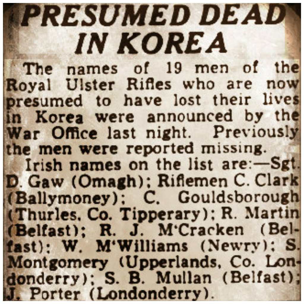 The War Office yesterday issued Korea casualties list No. 31. It gives the names of the following men of the Royal Ulster Rifles: – Missing – 6979990 Rifleman J. R. Anderson, 14122252 Rifleman C.D. Clarke…”