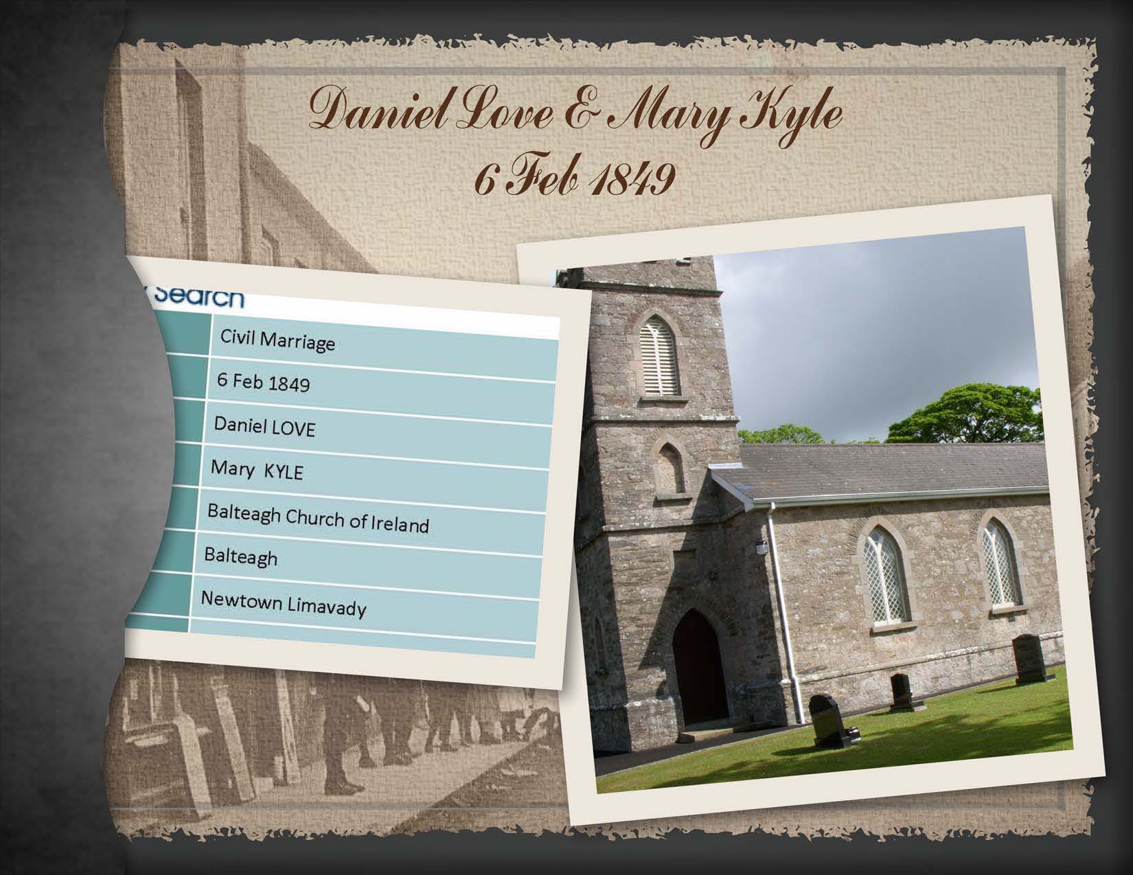 The Register of Marriages at St. Canice’s, Balteagh Church of Ireland shows that on 6 Feb 1849 Daniel married Mary Kyle. His father and father in law witnessed the wedding. Interestingly, one of his younger brothers, Matthew; would later marry one of Mary’s sisters in the same church.