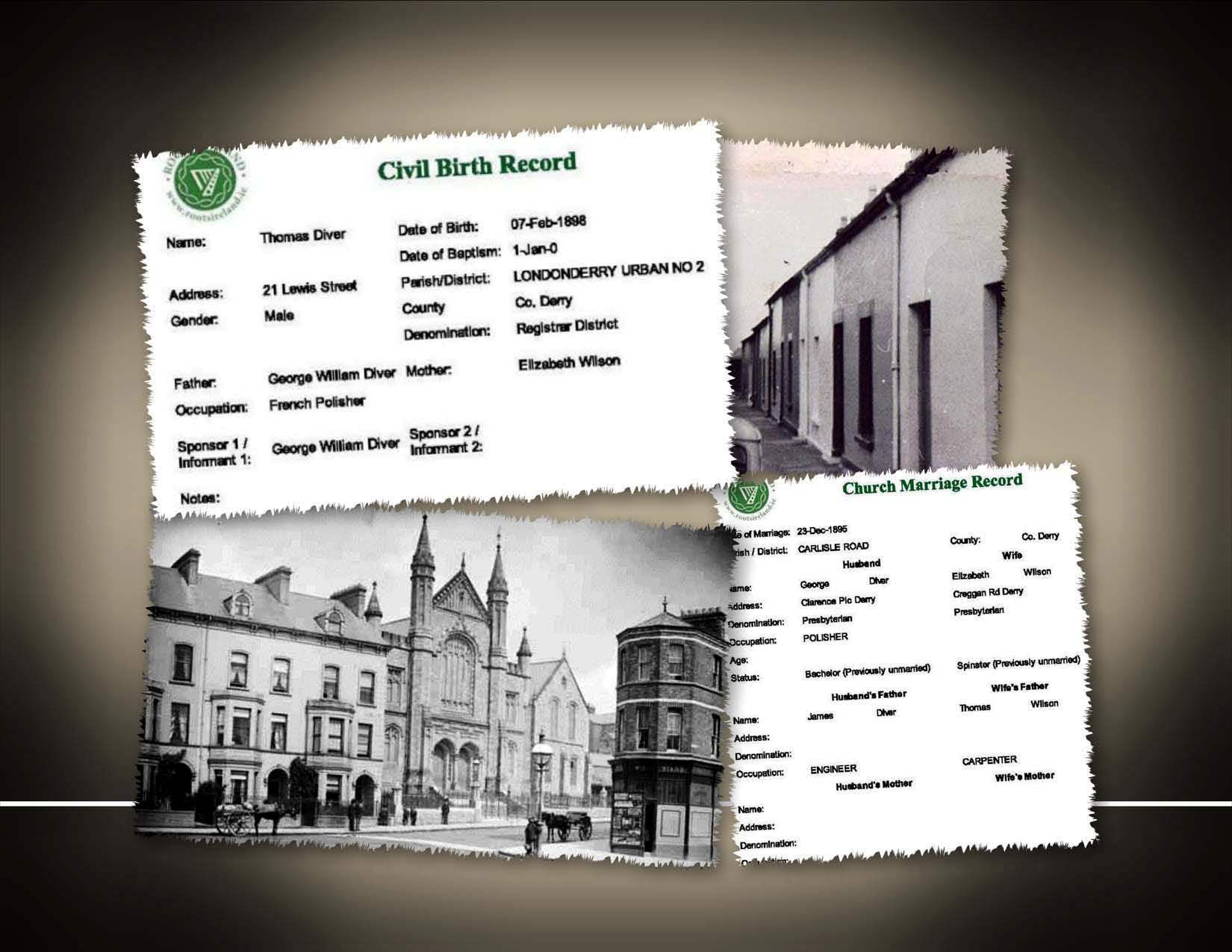Born on 7 Feb 1898 in 21 Lewis Street in the City of Londonderry, Thomas Wilson Diver was the second child and eldest son of eight born to George William Diver and, my great grand aunt; Elizabeth Wilson.