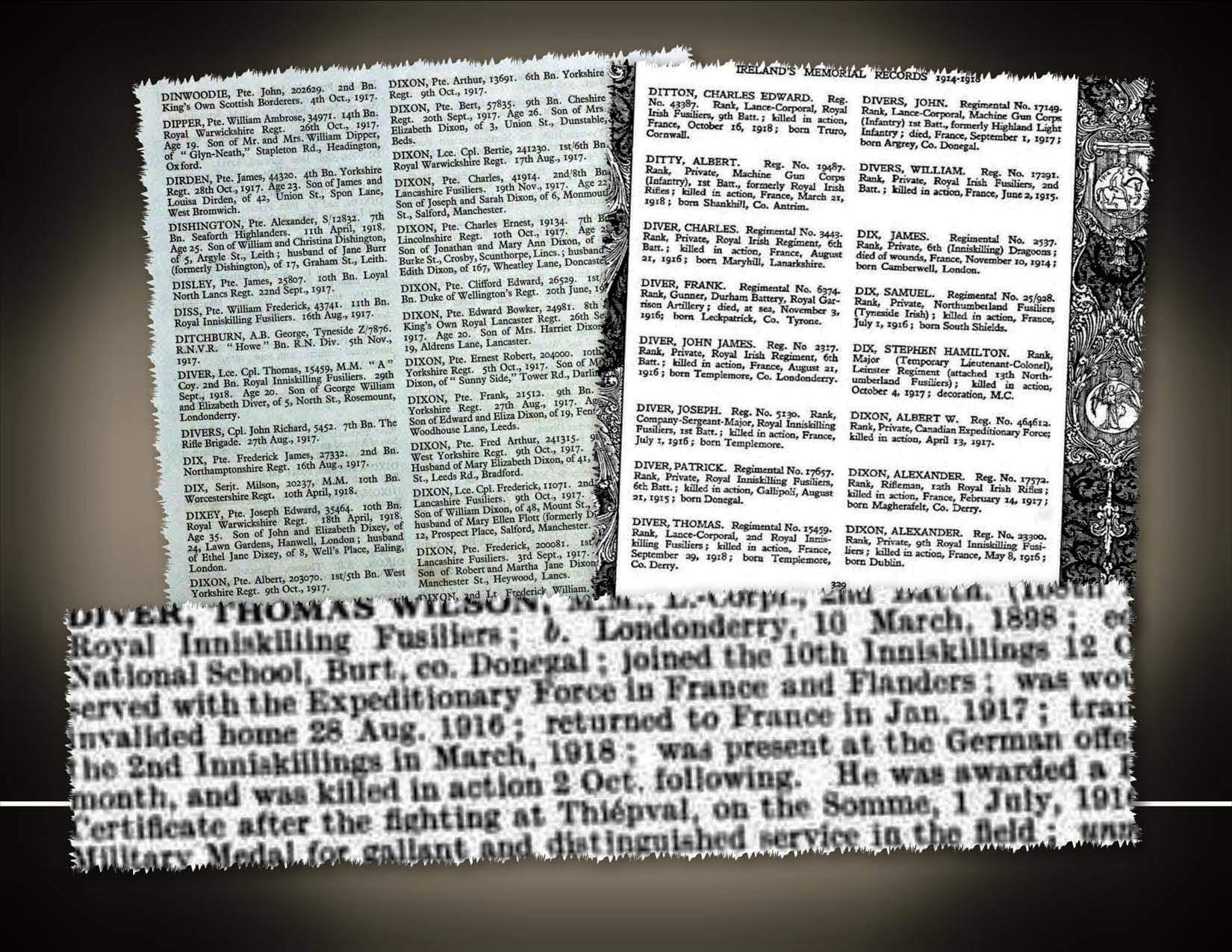 I would like to say a very special thank you to Nigel Henderson of Great War Belfast Clippings who provided me with a newspaper clipping of a notice which read: “Lance Corporal T.W. Diver, Royal Inniskilling Fusiliers, Creggan Road, Derry, who has received an Ulster Division Certificate, commended for gallantry in the field.” The best part… it came with a photo! Many thanks Nigel!