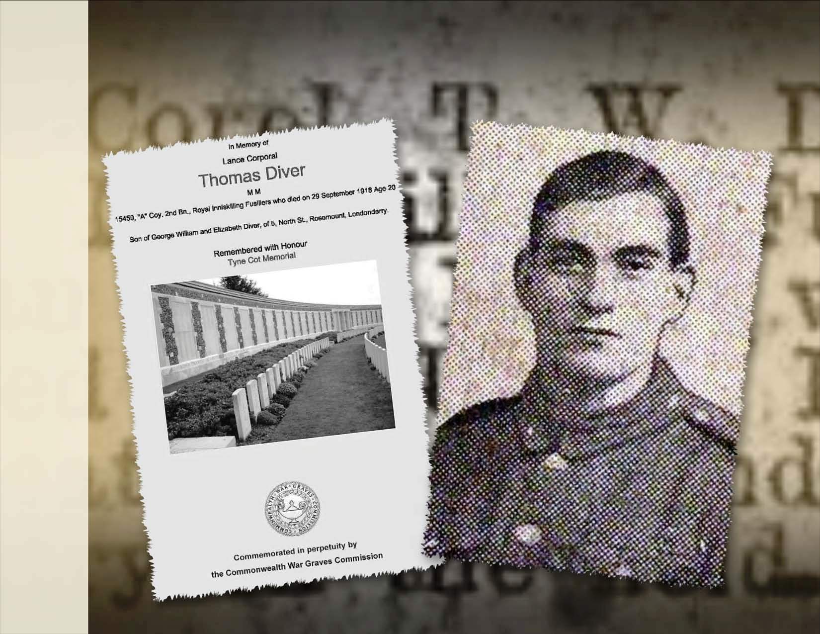 His life was cut short… Thomas Wilson Diver, not only is he Remembered with Honour at the Tyne Cot Memorial and Commemorated in Perpetuity by the Commonwealth War Graves Commission; he is commemorated on the Diamond War Memorial in Londonderry.